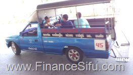 "Song-Teaw" is a blue high roof truck. This mode of transportation was mainly used by the locals and a bit cramp.